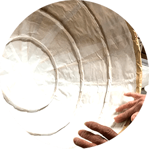 数日間かけての紙貼り作業にて形状を整えてるところまで、各工程ごとに熟練の職人の手によって一つ一つ丁寧に作り上げています。